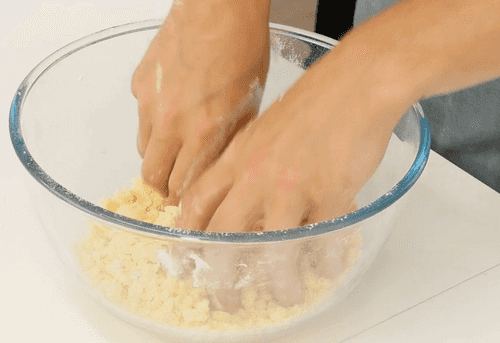 Sift the flour, add a pinch of salt, and mix in the chilled butter with your hands until it resembles crumbs or sand.