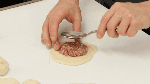 Roll the dough into a thick pancake, carefully place the filling in the center. Pinch the edges of the dough, leaving a small hole on top.