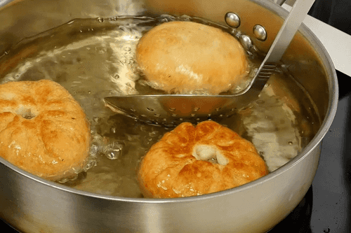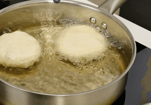 Belyashi should be fried in vegetable oil using a semi-submersion method. First, heat a sufficient amount of oil in the pan well.