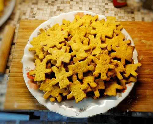 Roll the dough to a thickness of 0.5 cm. Cut out cookies, transfer to a baking sheet, and bake for about 20 minutes. They should only be slightly browned.