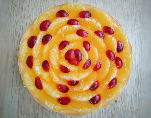 Dip all the fruits in orange jelly with a brush, place the cake in the cold for 30 minutes. After this time, evenly distribute the remaining jelly on top.