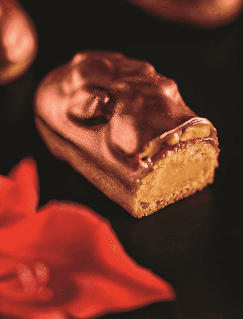 Assembly and decoration. Fill the éclair with caramel cream. Glaze the éclair with caramel glaze. Attach peanuts in caramel on top of the glaze. Place the éclairs in the freezer. Melt chocolate and add cocoa butter. Dip frozen éclairs halfway into the glaze at any temperature. Using a fluffy brush and bronze shimmer, dust the chocolate part of the éclair. Transfer to the refrigerator until fully thawed.