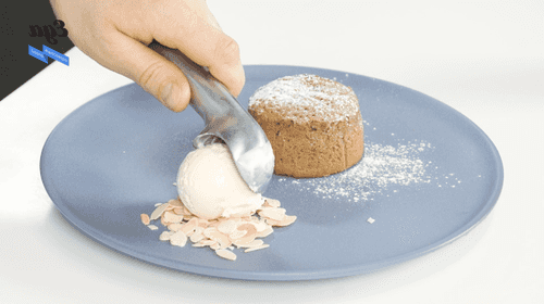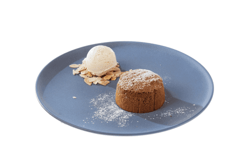 Place the finished fondant on a plate and sprinkle it with powdered sugar. Next to it, add some almond flakes and place a scoop of ice cream on top.