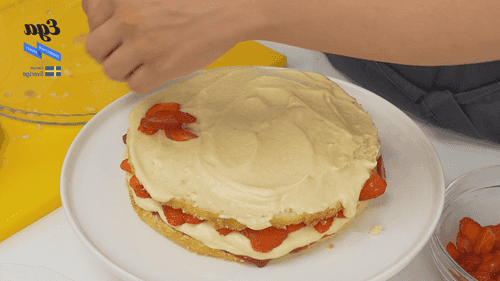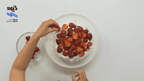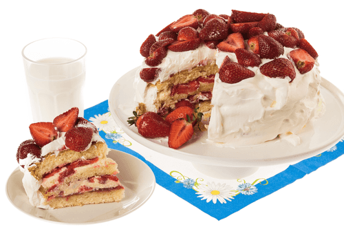 Whip the cream before serving. Coat the sides and top of the cake as desired. Cut the strawberries in half and arrange them on the surface of the cake.