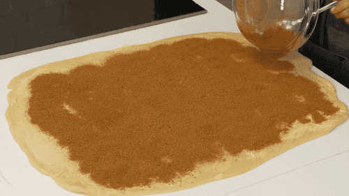Roll out the dough into a rectangle approximately 45x50 cm. Spread 75 grams of softened butter on the dough and evenly sprinkle with a mixture of sugar and cinnamon.