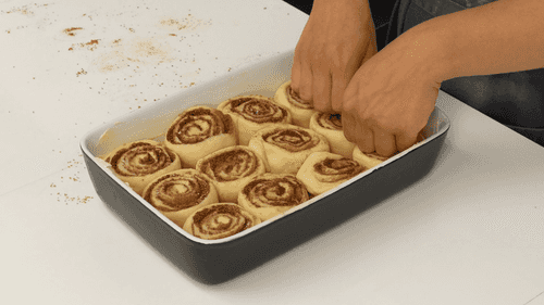 Tightly roll the dough into a 45 cm long roll. Cut it into twelve equal buns. Take a baking dish about 22x33 cm, grease it with butter, and tightly arrange the buns. Cover with plastic wrap or a kitchen towel and place in a warm place to rise for 45 minutes.