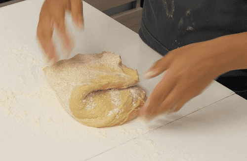 Add eggs and milk mixture to the flour mixture and mix with a mixer on low speed for 30 seconds. Then gradually add the remaining flour and knead the dough.