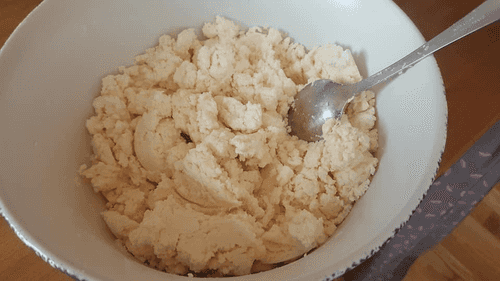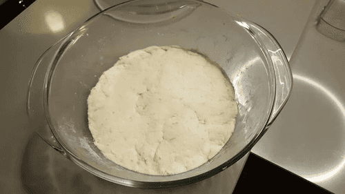 Take out the mixture, sprinkle rice flour on a plate. Divide the cottage cheese dough into roughly equal pieces (2 packs yield 8-10), roll in flour, and form balls.