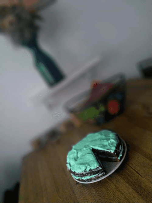 For the cream, mix softened butter with very cold Philadelphia cheese and powdered sugar. First stir with a spatula, then whip. Add about 50 ml of mint syrup (taste: it should have a strong mint flavor but not be overly sweet) and optionally turquoise or emerald food coloring, then whip again.