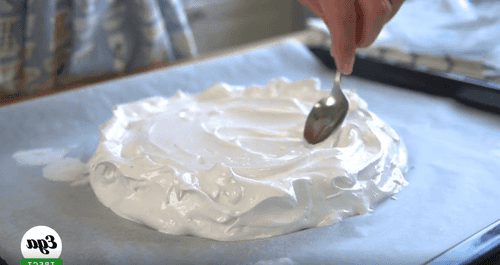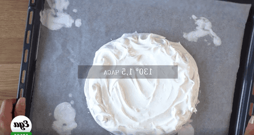 Stick baking paper (with a good coating) to the baking tray, spread the meringue (you can draw a circle with a diameter of 21-23 cm. The meringue will increase slightly in volume).