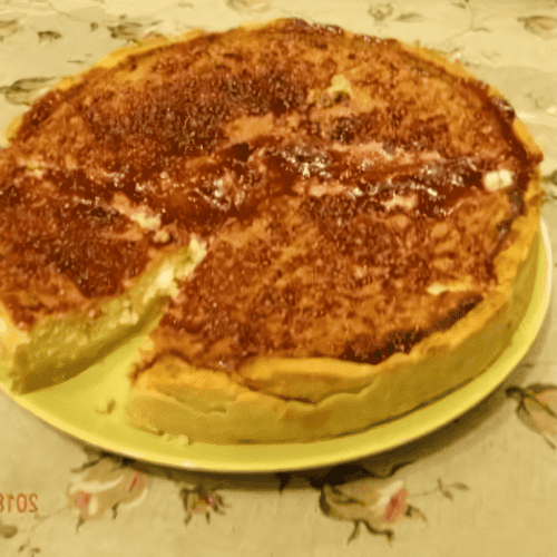 Cottage cheese and pear pie is a refined combination of delicate cottage cheese mousse and sweet, fragrant pear encased in a fragile buttery crust. This dessert has European roots and is a popular choice for cozy home tea gatherings. Pears add natural juiciness and light fruity sweetness to the pie, while cottage cheese contributes a creamy texture and rich flavor. The baked golden crust provides a contrast between the crispy base and soft filling. The pie is perfect as a standalone dessert or paired with a cup of fragrant tea or coffee. A layer of jam completes the flavor symphony by adding a subtle fruity tartness. This pie not only delights with its taste but also fills the home with warmth and coziness, making any moment special.