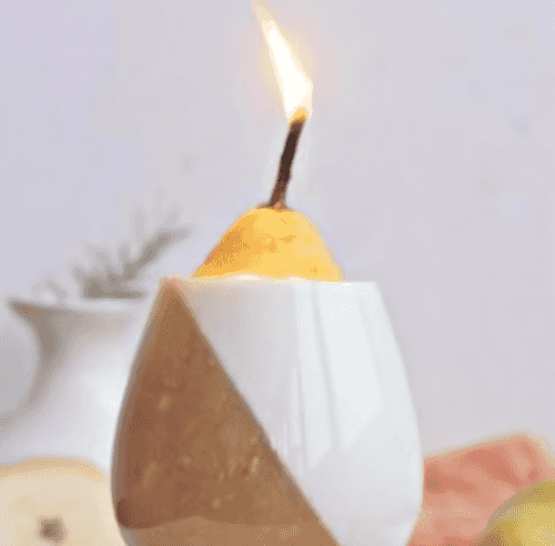 Then, place the glass upright and pour in the panna cotta. Let it set. Decorate with a slice of pear on top and leave in the fridge until fully cooled.