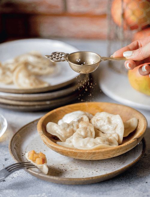 Vareniki with apple and pear are a refined dish of Ukrainian cuisine, infused with warmth and family traditions. The sweet fruit filling of apples and pears, seasoned with cinnamon and vanilla, makes the taste of these vareniki tender, aromatic, and slightly caramelized. The thin dough, handmade, becomes soft and elastic after boiling, and the dish pairs perfectly with sour cream or honey. Historically, vareniki hold an important place in Ukrainian gastronomy, symbolizing the coziness of home and hospitality. They are prepared for holidays, family gatherings, and everyday meals while enjoying their simplicity and refined taste. This dish not only satisfies but also provides pleasure in every bite.