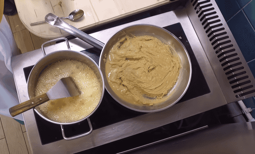 Make the album: place a large pan on low heat. Add melted butter and flour to the pan. Heat on low until light caramel color. The taste should be nutty. Keep warm until the caramel is ready.