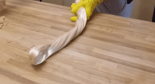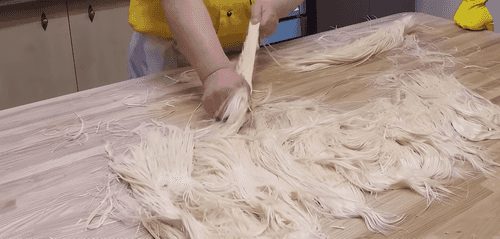 Once the caramel turns white, place it on the countertop and mix it with alba. Incorporate the caramel into the alba and stretch it on the table. Pull the caramel with alba into thin threads. Shape it in special molds.