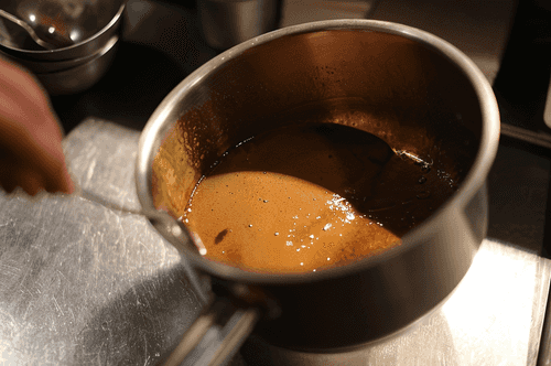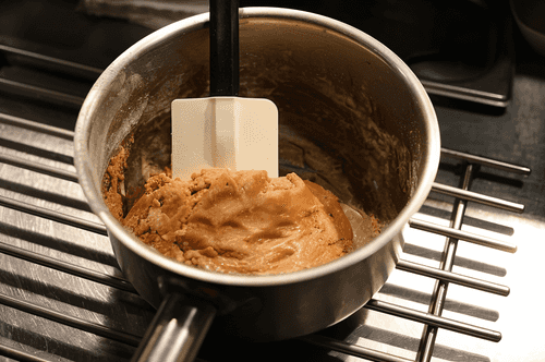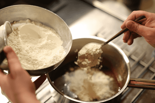 Remove from heat. Let it cool a bit. Then gradually add the sifted flour (0.5 part), stirring constantly.
