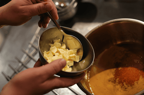 Add cubed butter, 1 tablespoon of cookie spices and mix into a homogeneous mass. Remove from heat. Let it cool slightly. Then gradually add the sifted flour (0.5 part), stirring constantly.