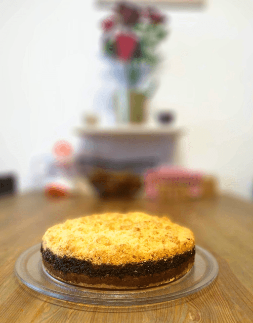 And at the end, evenly sprinkle the second half of the first mixture very carefully, without pressing down, so that the top layer remains airy and does not mix with the filling.