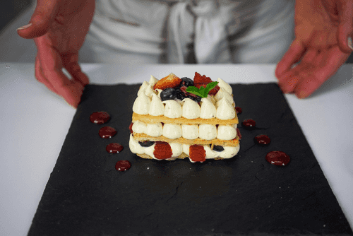 Cover with cream using the third layer, and decorate it with cream and berries. The assembled millefeuille should be served and eaten immediately. If placed in the fridge, the layers will soak up the cream and turn into 'Napoleon'.