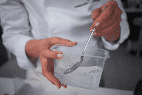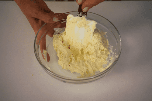 Take the cream out of the fridge; it will be quite soft. Mix it with a spatula until smooth. Transfer the cream to a piping bag with a round tip.