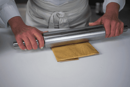 Place the butter mixture on parchment, spread it in a thin layer to form a square, and wrap it completely in paper. Roll it out on the parchment with a rolling pin several times until the mixture is flat and thin, no more than 5-7 mm thick. Put the butter in the refrigerator and keep it there until it hardens. This will take about 1 hour.