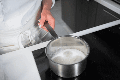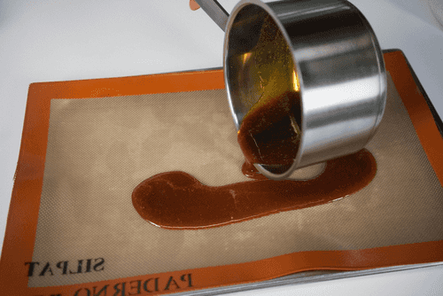 In 10-15 minutes, the sugar will turn into caramel. Watch to ensure the sugar doesn't burn; if it does, reduce the temperature. Pour the finished caramel in a thin layer onto a silicone mat and let it cool.