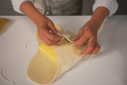 Take out the chilled butter. Check if it fits in the center of the dough and if the edges cover it completely. If not, set aside the butter and roll out the dough more or stretch it by hand. Wrap the butter in the dough like an envelope. The edges of the dough should overlap to cover the butter; press them tightly.