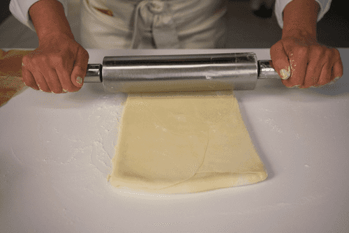 Roll the dough into a rectangle in two directions - away from you and towards you, but not across. The final thickness should be about 1 cm. The length of the dough piece should be about four times its width. Everything must be done very quickly because the butter melts. Remove excess flour from the surface.
