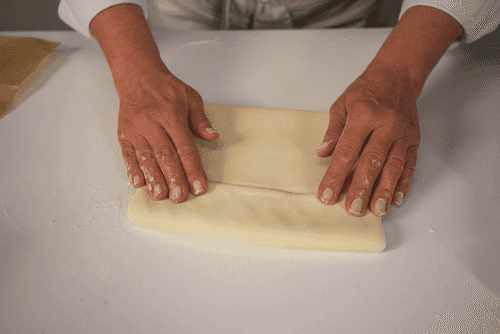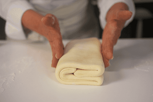 Fold the resulting dough in half. From the side, it will look like in the picture. These are the first four layers. Put the dough in the refrigerator for 30 minutes. Then take it out, roll it to a thickness of 1 cm, fold it in the same way, and put it back in the refrigerator. Repeat the procedure two more times.