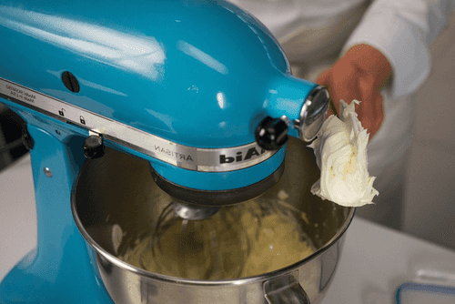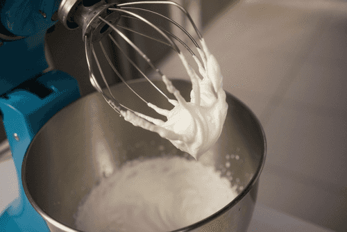 While the dough is baking, prepare the cream. Whip cold cream at maximum mixer speed until soft peaks form, which will take 5-7 minutes. Place the cream in the refrigerator to prevent it from deflating.