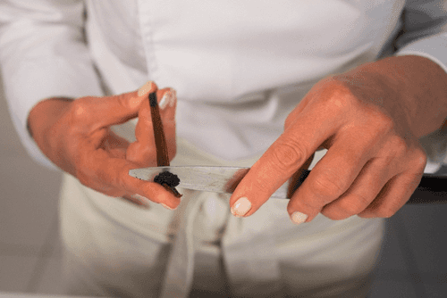 Put the yolks to whip. Add seeds from one vanilla pod to the yolks. Do not throw away the pods; they can be added to the sugar syrup while cooking, making it vanilla-flavored with a pleasant caramel hue.