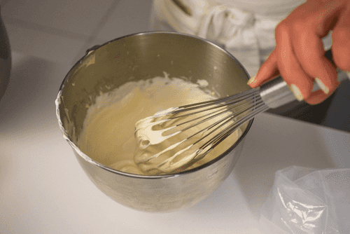 Without stopping to whip, add hot syrup to the yolks, followed by gelatin (previously soaked in cold water and squeezed). Then add mascarpone and whip until everything is homogeneous. Make sure the mascarpone doesn't stick to the sides of the bowl. If needed, stop the mixer, stir the cream with a spatula, and then continue whipping.