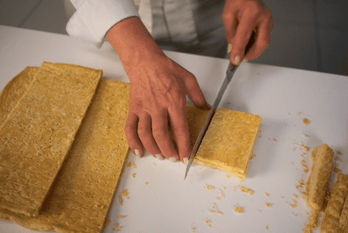 In the end, the dough will have 256 layers. In the fridge, this dough can last a week; in the freezer — three months. Besides mille-feuille, you can make pastries, pies, and cakes from it. It should be cut with a very sharp knife or pizza cutter to avoid sealing the layers.