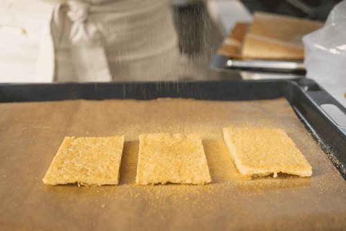 Place the layers on a baking sheet and sprinkle with a thin layer of caramel through a sieve. The caramel is needed for the layers to be covered with a thin crispy layer for texture, not for taste. Send to an oven preheated to 220 degrees for a few minutes. It is advisable to use the top heating. As soon as a slightly browned crust appears, take it out: do not overcook the caramel, it will burn and ruin the layers as well. A slightly set thin crust is needed. Cool the layers.