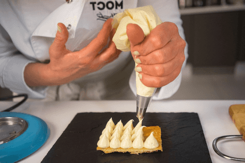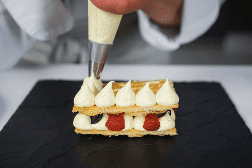 Choose one layer and place it on a serving plate. You can drop a bit of cream under it to prevent it from sliding on the plate. Squeeze peaks of cream onto the first layer. If the cream spreads, either it or the layers are not cold enough. To keep the millefeuille's shape intact, all ingredients must be cold.