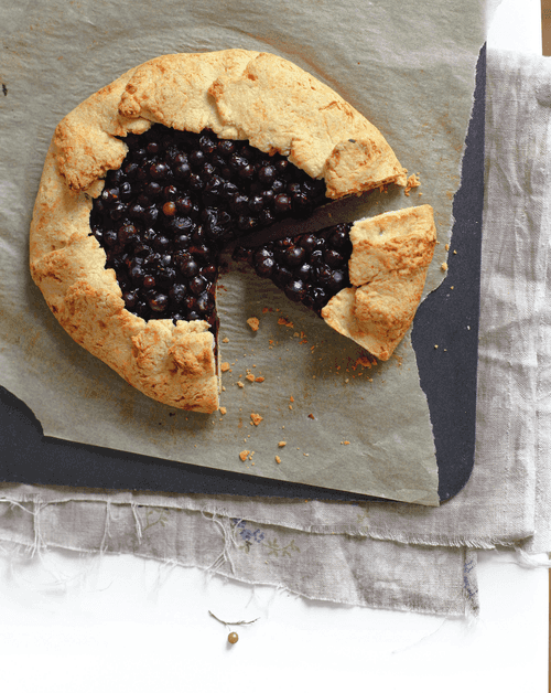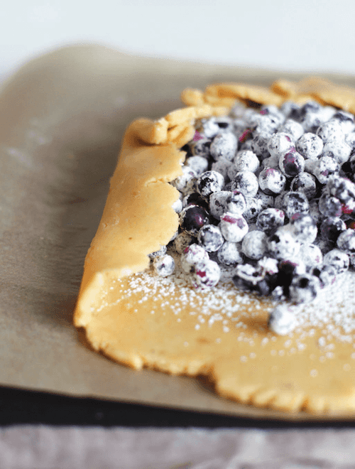 Bake at 200 degrees for 30 minutes until the galette is golden brown. During baking, stir the berries once with a spoon to avoid leaving traces of powder and starch on top. Let it cool completely before slicing.