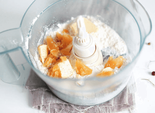 To prepare the dough, place all ingredients except the egg in the bowl of a food processor and chop into fine crumbs.
