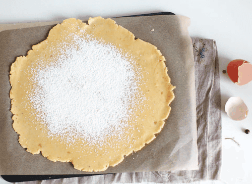 Roll the dough on a sheet of parchment paper into a circle with a diameter of 30–35 cm, transfer the sheet with the dough to a baking tray. Sprinkle the dough with 1 teaspoon of starch.