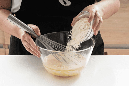 Whisk the yolks with 40 grams of sugar until fluffy and pale. Add milk, 60 ml of vegetable oil, and mix in flour and salt.