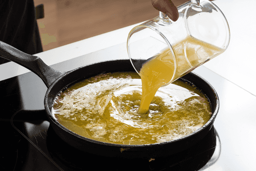 For the sauce, melt the butter over medium heat, add sugar, stir, and pour in the orange juice. Continue to cook, stirring, until the sauce starts to thicken.