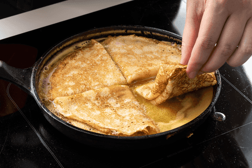 Roll the pancakes into triangles and place them in the sauce. Heat for 1 minute and transfer to a plate. Drizzle with the remaining sauce.