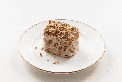 Layer five to six layers in the same way until the mold is filled. Spread cream on top.