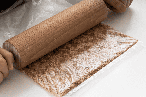 Place the salted sticks in a bag and roll them into a fine crumb with a rolling pin. Sprinkle this crumb over the cake. Let the cake rest in the refrigerator overnight.