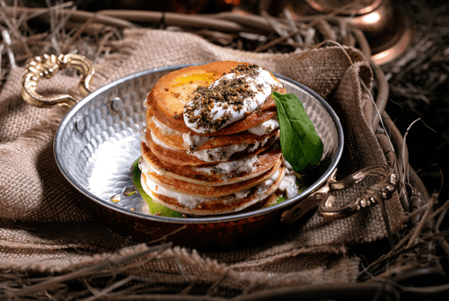 Decorate the stack of pancakes with yogurt and sprinkle with za'atar.