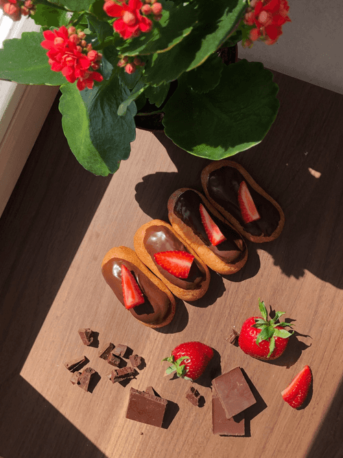 Glaze: melt chocolate in a water bath. Decorate the éclairs.
