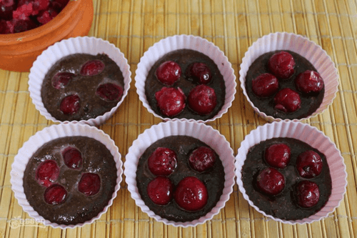 Pour the obtained mass into a quarter of the molds, add cherries, and fill the remaining half.