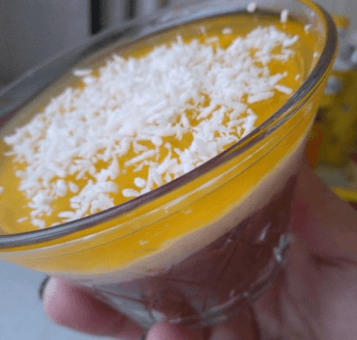 Next, add the jelly, pour the last layer, and leave it to set completely. Decorate with coconut flakes.