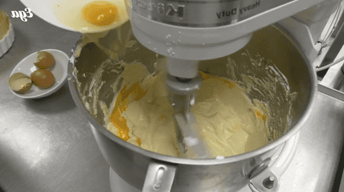 Add sour cream and cream to the bowl, continuing to mix. Then add the eggs one by one.