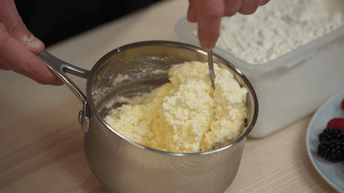 Mix the egg, cottage cheese, sugar, and flour. The consistency should be neither liquid nor dry.