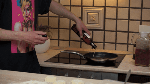 Heat the pan. Cheese pancakes must be placed on a heated pan, but reduce the heat to medium. Pour about 50 grams of sunflower oil into the pan; olive oil can also be used.